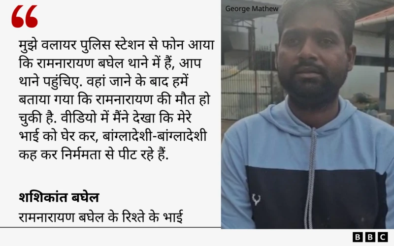 त्रिशूर मेडिकल कॉलेज में रामनारायण का शव लेने पहुंचे शशिकांत बघेल ने कहा, “मुझे वालायर पुलिस स्टेशन से फोन आया कि रामनारायण बघेल थाने में हैं, आप थाने पहुंचिए. वहां जाने के बाद हमसे पूरी जानकारी ली गई. उसके बाद हमें बताया गया कि रामनारायण की मौत हो चुकी है. वीडियो में मैंने देखा कि मेरे भाई को घेर कर, बांग्लादेशी-बांग्लादेशी कह कर निर्ममता से पीट रहे हैं.”